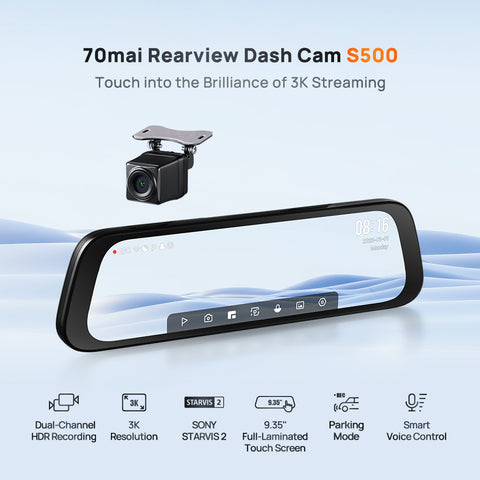 The S500 connects to the 70mai App via the dash cam's WiFi, enabling users to access real-time footage, take photos, download photos/videos to their phone, or share directly on social media. Users can also adjust settings such as resolution level, recording duration, G-sensor sensitivity, etc.