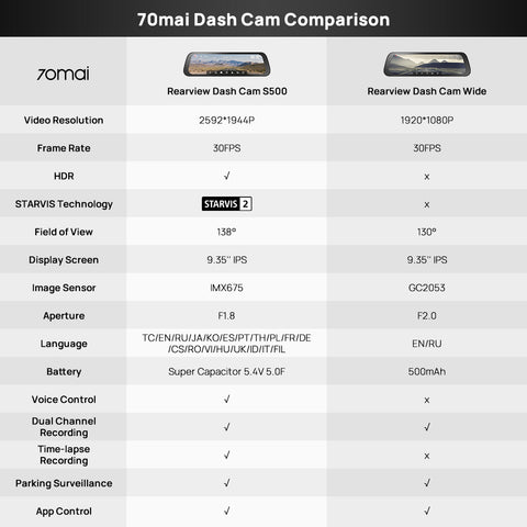 The S500 connects to the 70mai App via the dash cam's WiFi, enabling users to access real-time footage, take photos, download photos/videos to their phone, or share directly on social media. Users can also adjust settings such as resolution level, recording duration, G-sensor sensitivity, etc.