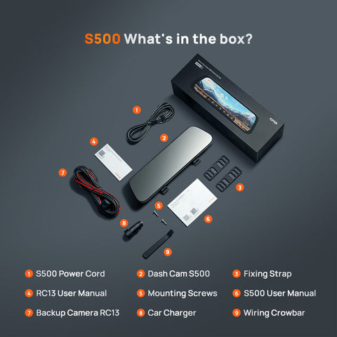 The S500's extendable body ensures a snug and perfect fit,Capture exactly what you need with the adjustable camera,Featuring an installation method with elastic rubber straps, it fits a wide range of rearview mirror sizes.