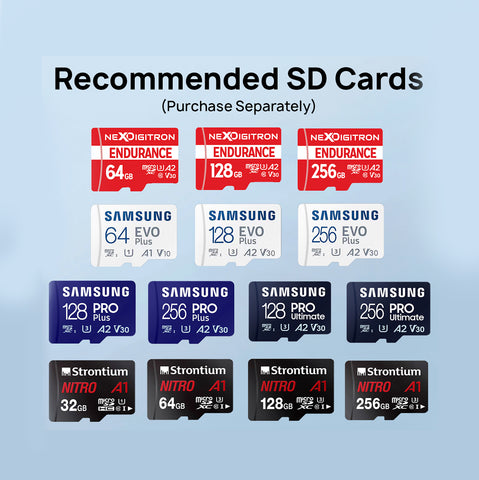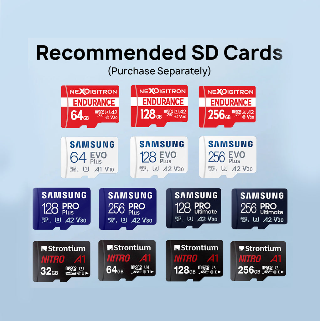 We suggest purchasing recommended Micro SD Cards Only (64 GB, 128 GB or 256 GB)