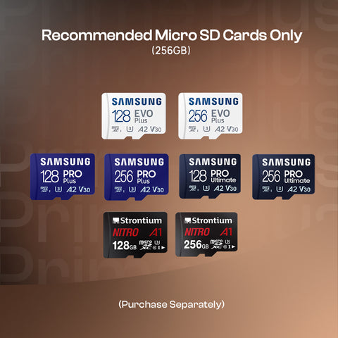 We suggest purchasing recommended Micro SD Cards Only (128 GB or 256 GB)